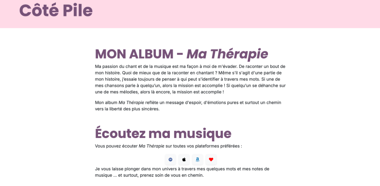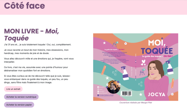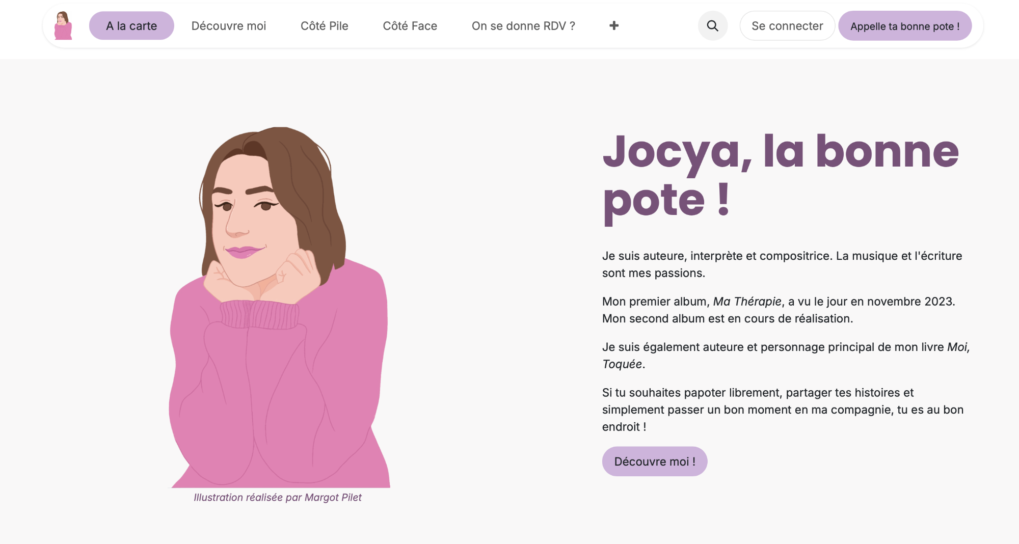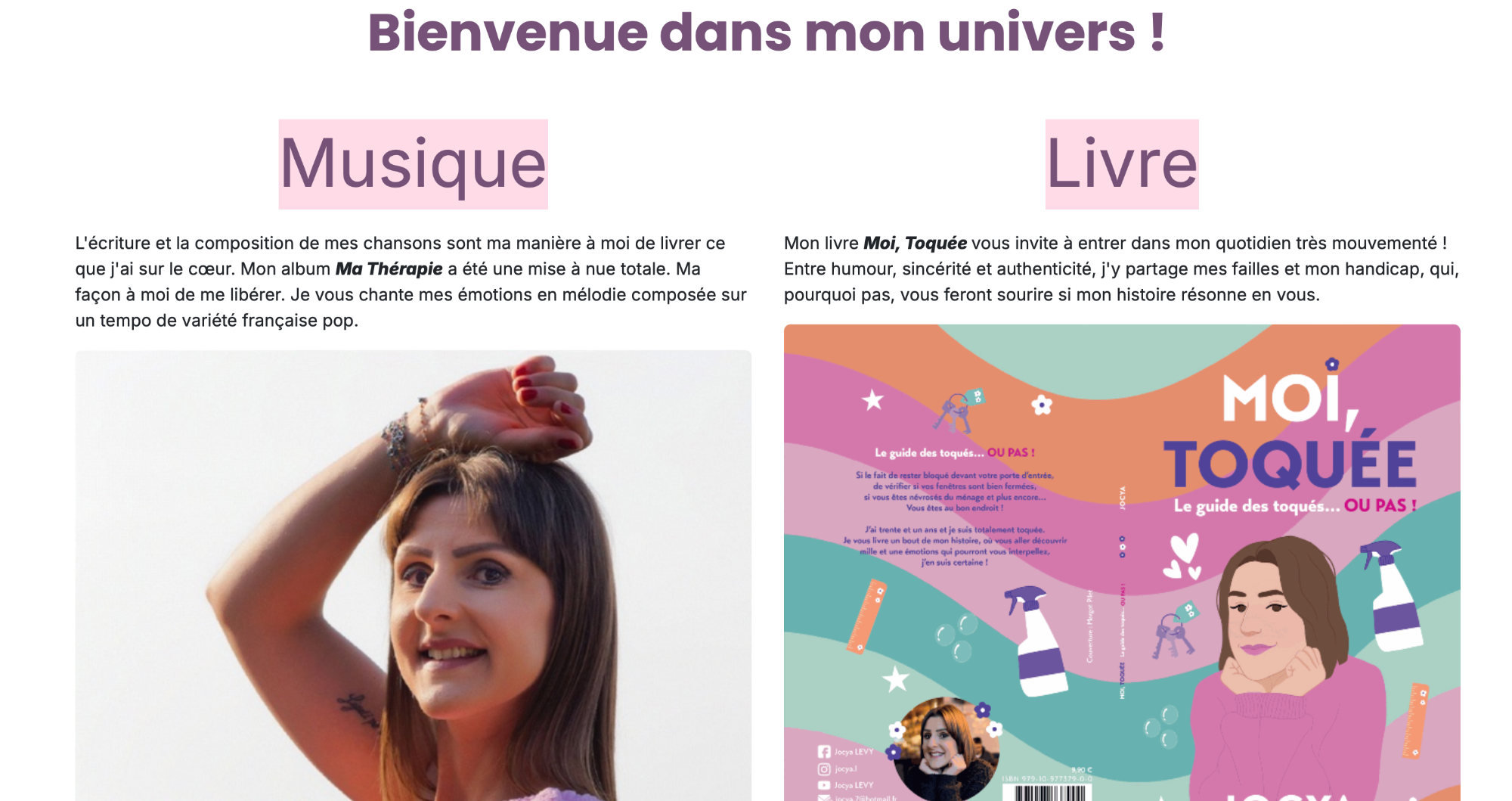 Voici quelques captures d’écran du site vitrine de Jocya, que j’ai créé et personnalisé afin de mettre en valeur son univers artistique.